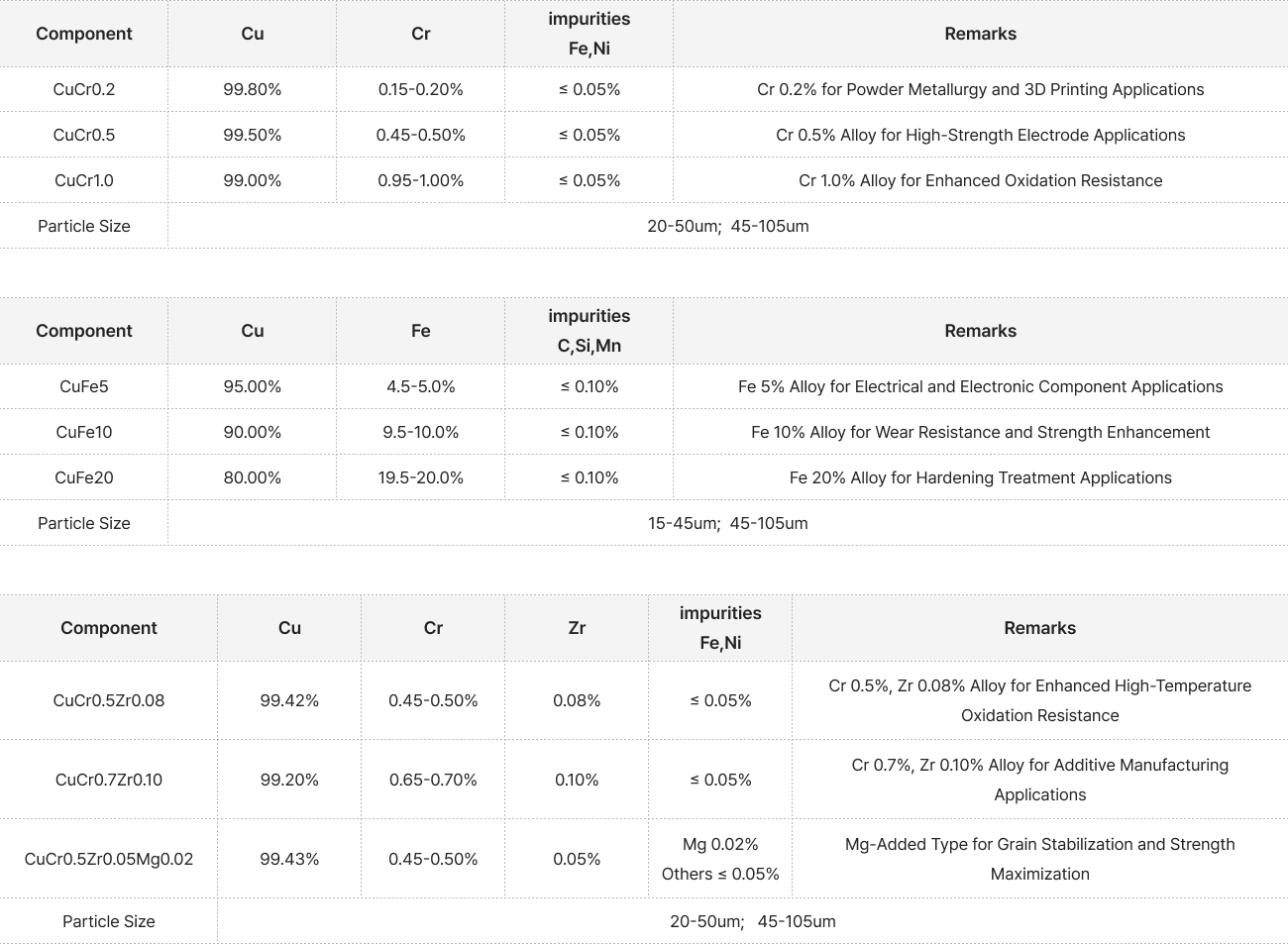 Spherical Copper Alloy Powder is a copper (Cu)-based alloy powder manufactured in spherical form. It is primarily used in 3D printing, powder metallurgy, thermal spray coating, conductive materials, heat dissipation components, and electrode materials. The spherical morphology provides excellent flowability, packing density, and uniform layering quality, making it well-suited for the fabrication of high-precision metal parts.
