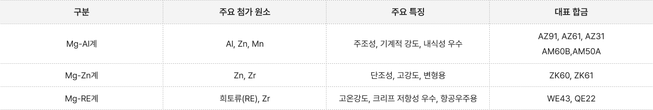 - 주조성 우수: AZ계, AM계는 고유동성으로 복잡한 형상 주조 용이